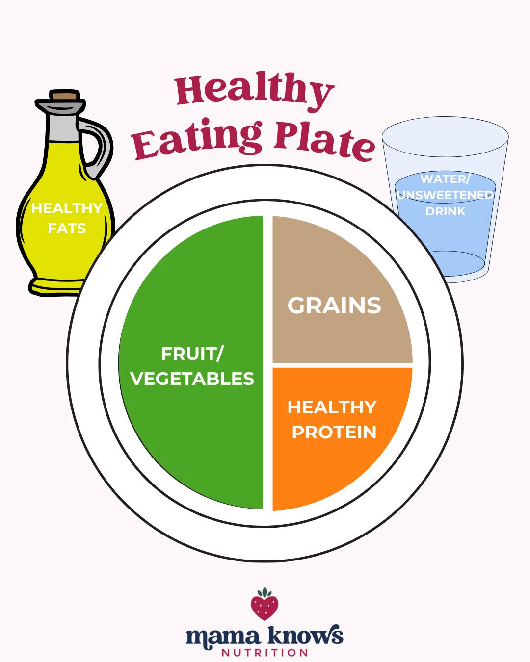 This plate helps visualize proportions of each food in your meal. You don’t have to ALWAYS follow this, but it’s a great guide. One huge tip: eat slowly and without distractions (besides your kids 😅). Eating fast and in front of a screen makes it so much harder to listen to your body’s fullness cues. I like to stop eating when I feel almost full so I don’t accidentally overeat and get a stomach ache. I rather need a snack later than feel uncomfortably full. The big picture The goal with portion sizes isn’t precision. It’s helping kids (and ourselves) stay connected to hunger and fullness. That means:
